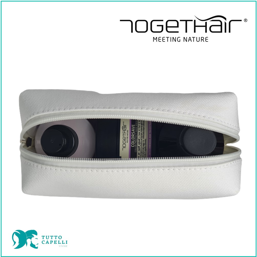 Un pratico Beauty Case con cerniera, impermeabile all'interno, in cotone naturale all'esterno, contiene i tre prodottI