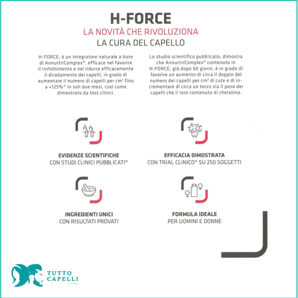 H-FORCE è un integratore naturale a base di Annurtricomplex, Selenio, Zinco, Biotina e Rame. E' efficace nel favorire il rinfoltimento e ridurre il diradamento dei capelli. Test clinici e studi scientifici pubblicati dimostrano che già dopo poche settimane da risultati molto evidenti.